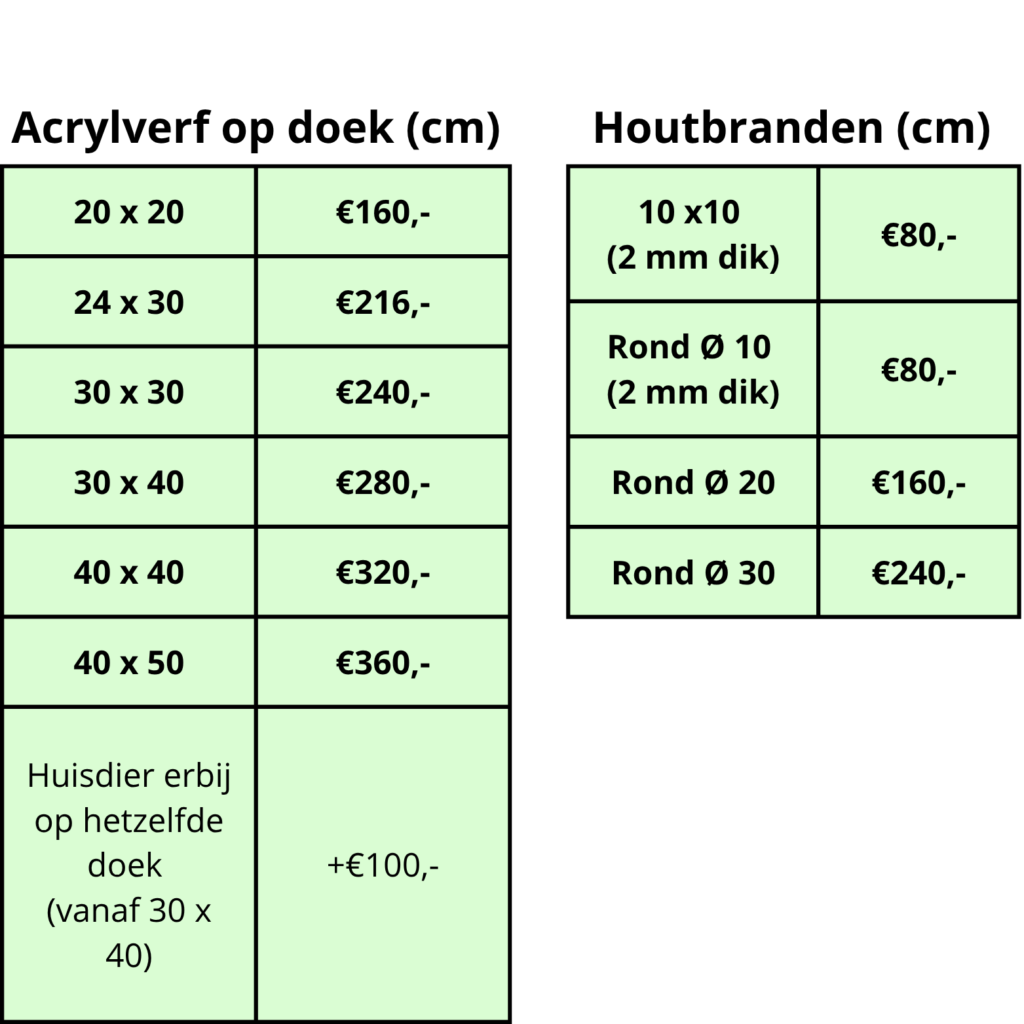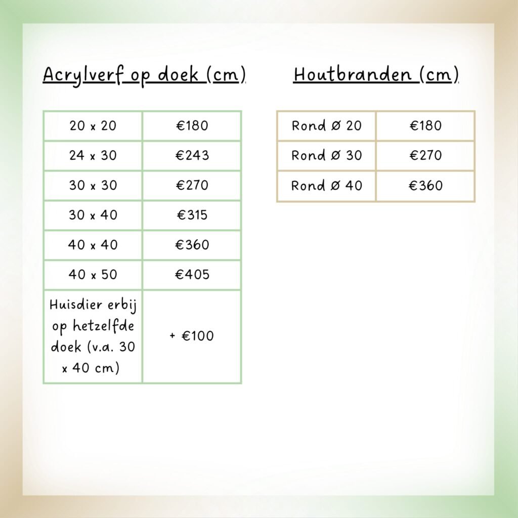 De prijzen zijn in euro´s en exclusief verzendkosten. Dit is afhankelijk van het formaat, gewicht en naar welk land het moet worden verstuurd. De ontvanger zal zelf rekening moeten houden met de importkosten, mochten deze van toepassing zijn. De totale kosten inclusief verzendkosten stuur ik je in een offerte voordat ik begin met je portret.